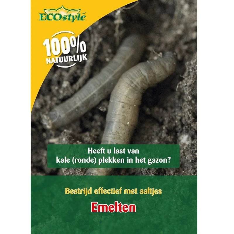 Emelten zijn larven van langpootmuggen. Emelten hebben een lang, dik, grijsbruin lijf met aan de voorkant een soort van zuignap. Ze hebben geen poten. De beste omschrijving van de emelt is een kruising tussen een worm en een rups. Langpootmuggen leggen eitjes in het gazon, ze leggen wel 400 eitjes per keer. Dit kan dus al snel leiden tot een emelten plaag! Emelten zijn dol op gras, je hebt dan ook snel last van emelten in gazon of gras. Ze komen naar boven om aan jong nieuw gras te eten. Ze trekken het jonge gras hun kleine holletjes in. Hierdoor onstaan er in het gazon bruine, kale plekken. Je kunt de emelten uitstekend bestrijden met aaltjes van ECOstyle.