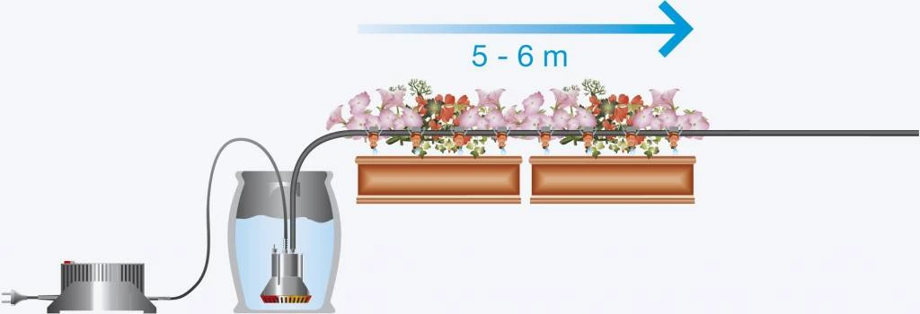 De set bestaat uit een transformator met draaischakelaar voor het selecteren van het besproeiingsprogramma, een 14 V laagspanningspomp met vuilfilter, 25 seriedruppelaars (2 l/u) met einddop en reinigingsnaald, 10 m verdeelbuis 4,6 mm (3/16″) en 15 buishouders.