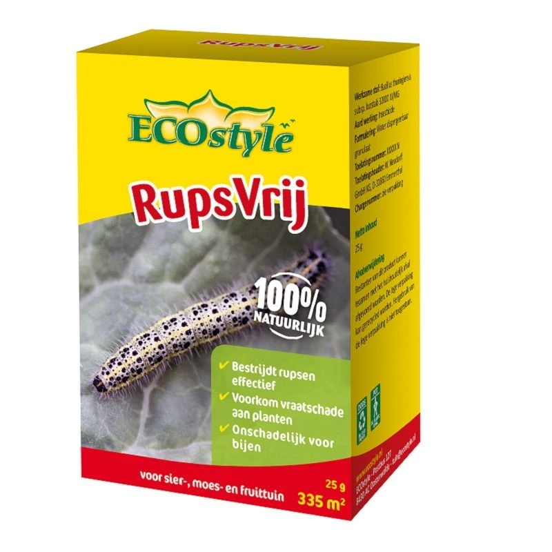 Bestrijdt rupsen 100% natuurlijk. Voorkomt bladschade door rupsen. RupsVrij is een biologische spuitvloeistof, met micro-organismen als natuurlijke werkzame stof. De rupsen, waaronder ook van de buxusmot, eten de bladeren met het opgespoten mengsel op. De vraat stopt binnen enkele uren en binnen een paar dagen sterven de rupsen. Onschadelijk voor bijen.