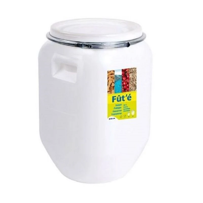 Een stevig kunststof vat, afsluitbaar, speciaal voor het bewaren van voedsel, maar ook geschikt voor vele andere dagelijkse toepassingen, zoals opslag en transport van dranken, voor fermentatie van fruit, voor opslag van diervoeder, maar ook geschikt voor graszaad, meststoffen, strooizout etc.